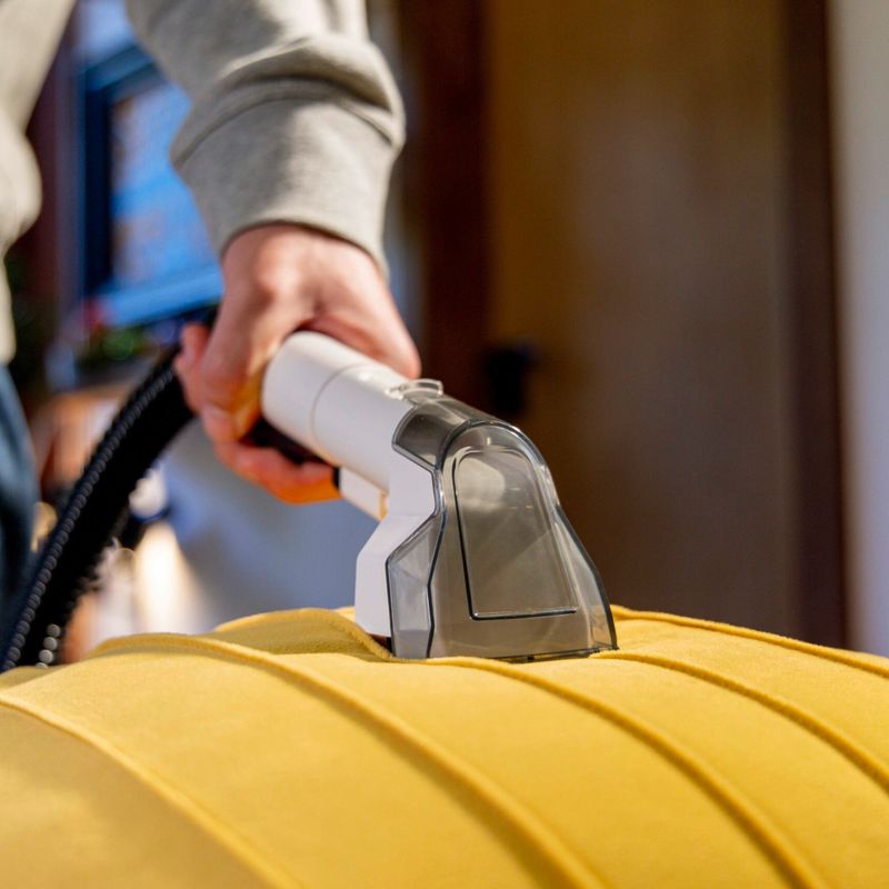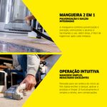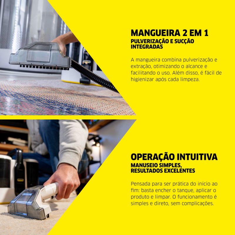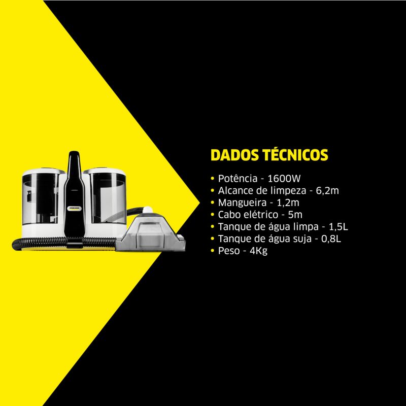Tecnologia 3 em 1 (1600W): Pulveriza, esfrega e extrai. Limpeza profunda de estofados e remoção de manchas com alta potência.