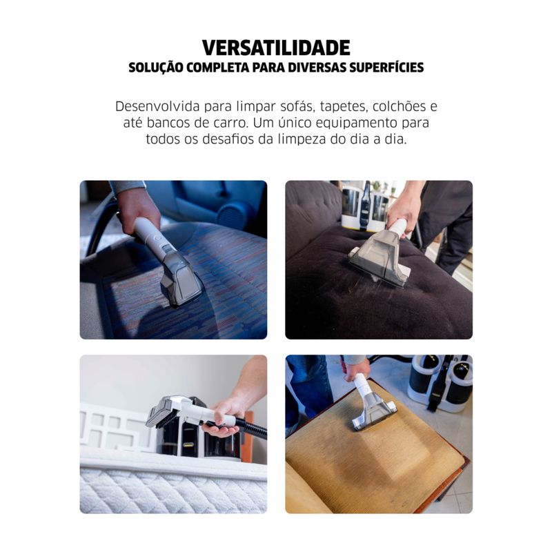 Compacta e Leve (4 kg): Portabilidade máxima para limpeza de sofás, tapetes e higienização completa de bancos de carro.