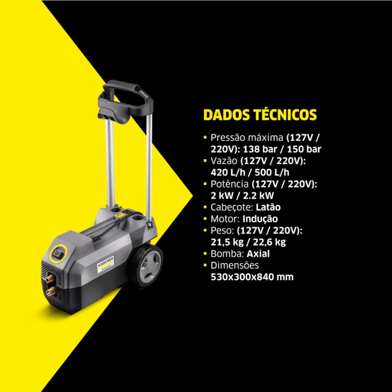 A Kärcher HD 585 Profi ajuda na remoção das sujeiras mais difíceis. Há mais de 25 anos líder da categoria, porém com novo design, possui acessórios profissionais de alta qualidade: Pistola com mangueira de alta pressão de 7,5m, lança baioneta 420mm revestida e bico power. Sua estrutura é durável e comportam os acessórios que facilitam o armazenamento. Com ótimo custo-benefício, confere excelente perfomance para limpeza de veículos, oficinas, áreas externas de casas de grande porte, clubes, condomínios, pequenos negócios, etc