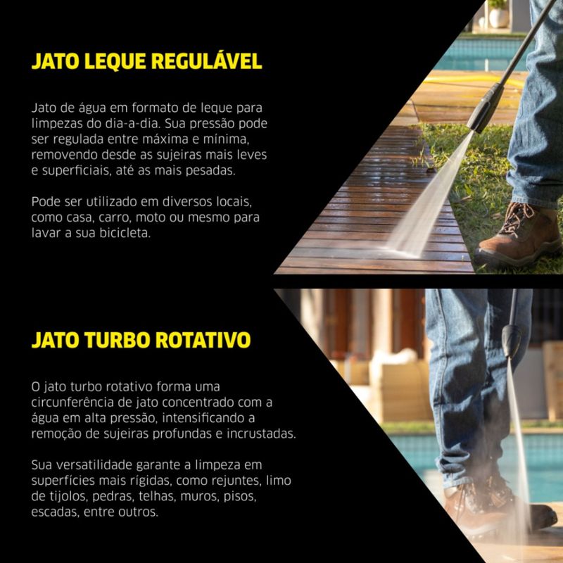 - Jato Leque Regulável: Permite ajustar a pressão da água para limpezas diárias, removendo desde sujeiras leves até as mais difíceis, ideal para casas, carros, motos e bicicletas.
