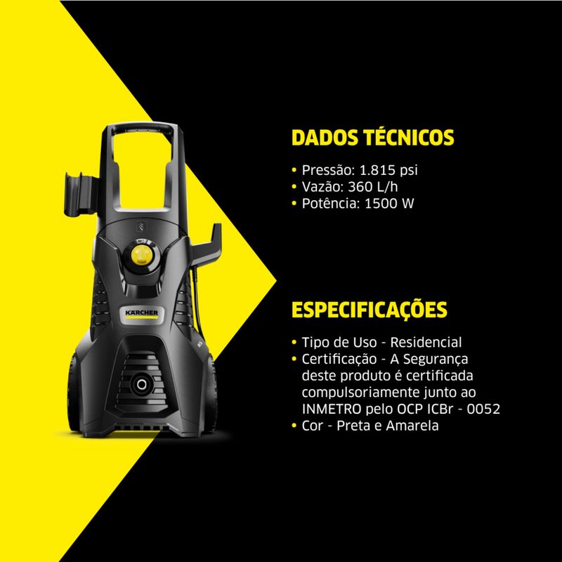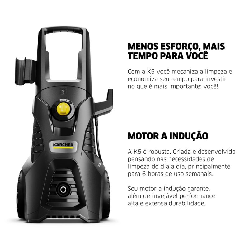 145 bar, a K5 Power encara sujeiras difíceis com facilidade. Sua vazão de 380 litros por hora garante maior agilidade no trabalho, enquanto o motor de indução proporciona durabilidade e funcionamento silencioso. Além disso, o uso da lavadora pode gerar até 80% de economia de água em comparação com uma mangueira comum — eficiência que você sente no resultado e no bolso.