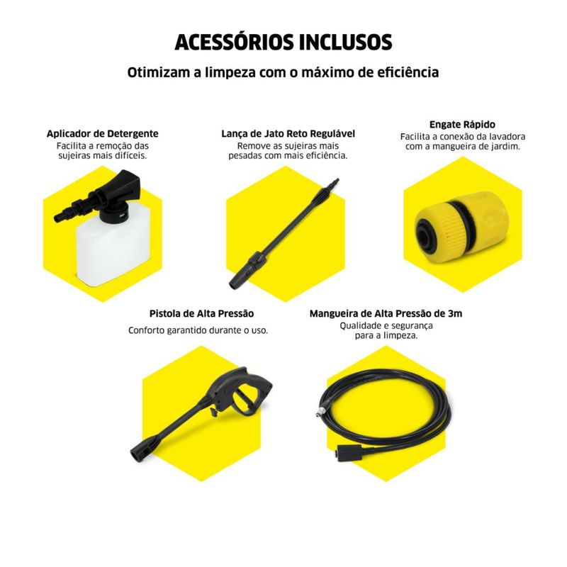 - Kit Completo e Pronto para Uso: Acompanha mangueira de 3 metros, pistola de alta pressão, lança com jato regulável e aplicador de detergente.