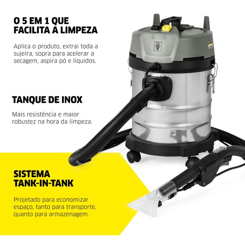 A Puzzi 4/20 Classic é uma extratora 5 em 1, que aplica o produto (aspersão), faz a extração, aspira pó e líquidos e possui função soprador para secagem. Com tanque de 20L para água suja e 4L para água limpa e solução química, permite a falta de contato com a sujeira, pois a água vai direto para o reservatório. É perfeitamente adequada para uso em residências, hotéis, escritórios, lava carros e muito mais.