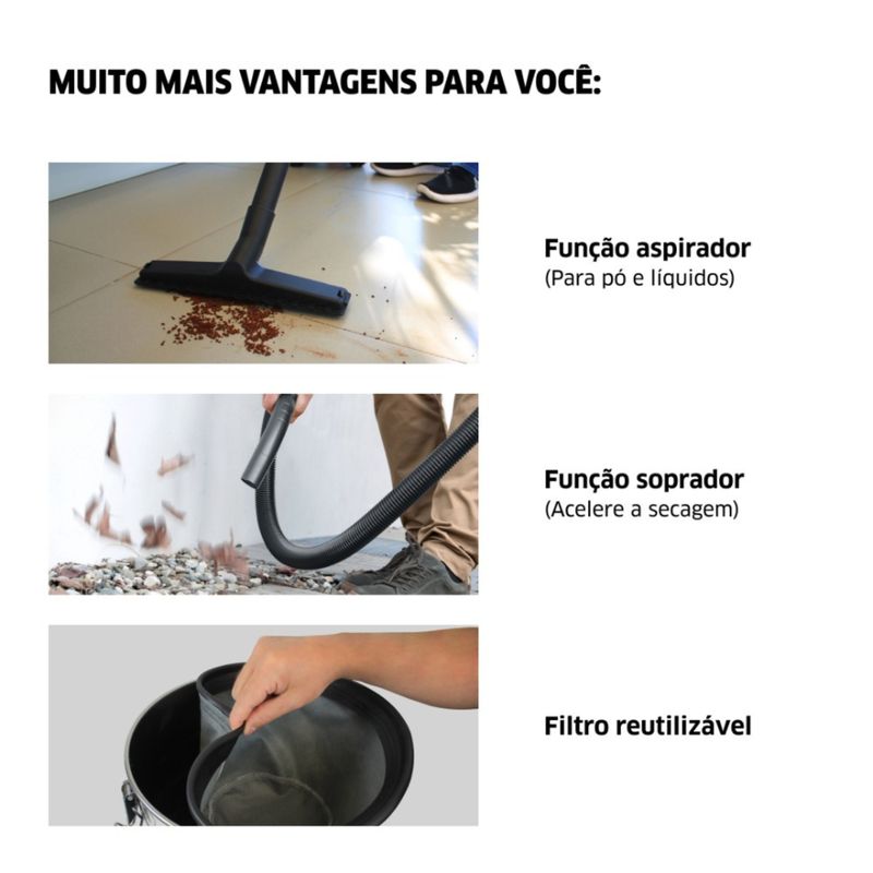 - Tecnologia 5 em 1: aspersão, extração, função soprador, aspiração de pó e líquidos.